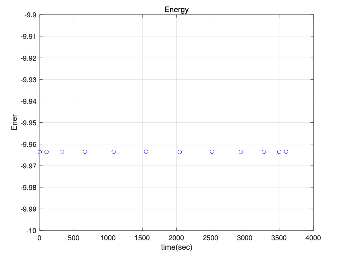아래 그림은 궤도와 위치벡터, 속도벡터, 에너지의 궤적을 그린 것이다. 에너지가 일정하게 나오므로 LPM 으로 푼 램버트 문제의 해가 안정적임을 보여준다.