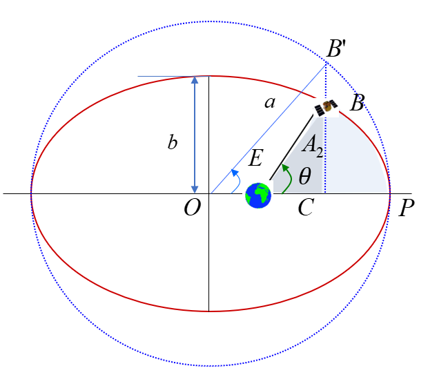 면적 \(A_1\) 은 다음과 같이 기하학적인 관계에 근거하여 계산할 수 있다. 우선 아래 그림과 같이 타원의 장반경 \(a\) 를 반지름으로 하는 가상의 원궤도를 그린다. 그리고 우주비행체의 위치 \(B\) 와 장축과 만나는 점 \(C\) 를 연결한 선을 연장하여 가상의 원궤도와 만나는 점을 \(B'\) 이라 한다. 이때 가상의 원궤도 중심 \(O\) 에서 \(B'\) 의 각을 이심 비행각 (eccentric anomaly)이라고 하고 \(E\) 라고 표시한다.