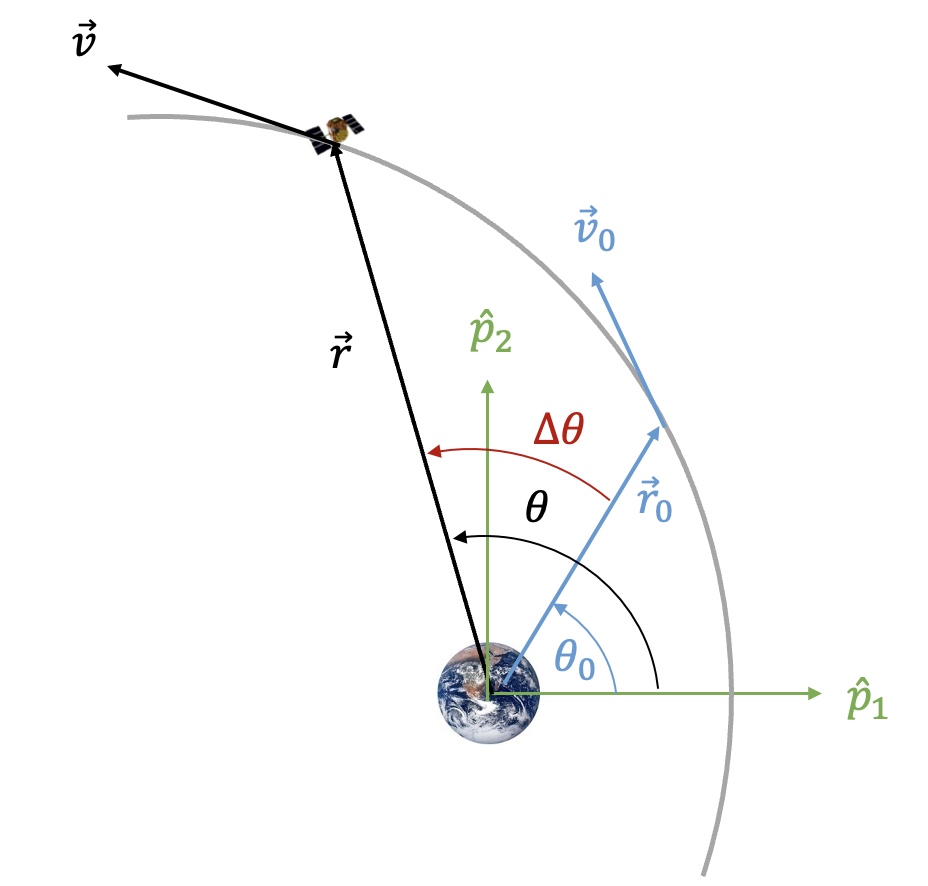 정리하면, 어느 우주비행체의 초기 위치벡터 \(\vec{r}_0\) 와 속도벡터 \(\vec{v}_0\) 가 주어졌을 때, 실제 비행각이 \(\Delta \theta\) 만큼 변화한 후의 위치벡터와 속도벡터 \(\vec{r}, \vec{v}\) 를 구하는 방법은 다음과 같다.