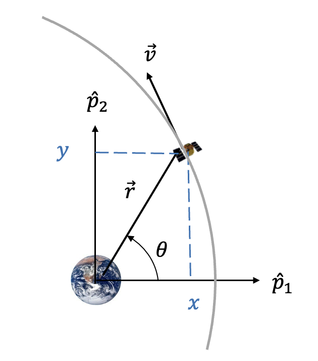 먼저 \(x\) 부터 시작하자. 지구중심과 우주비행체간의 거리에 관한 식,