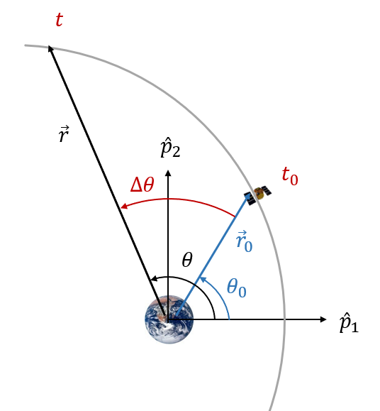 타원궤도를 돌고 있는 우주비행체의 위치벡터와 속도벡터 또는 고전 궤도요소가 시간 \(t=t_0\) 에서 \(\vec{r}_0, \vec{v}_0\) 또는 \( (a, e, i, \Omega, \omega, \theta_0 )\) 로 주어졌을 때, 비행시간이 \(t-t_0\) 만큼 경과한 후의 실제 비행각 \(\theta\) 는 다음과 같은 순서로 계산할 수 있다.