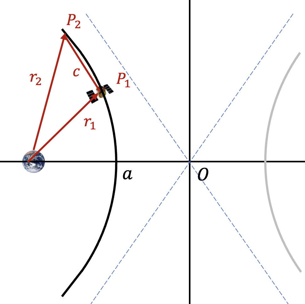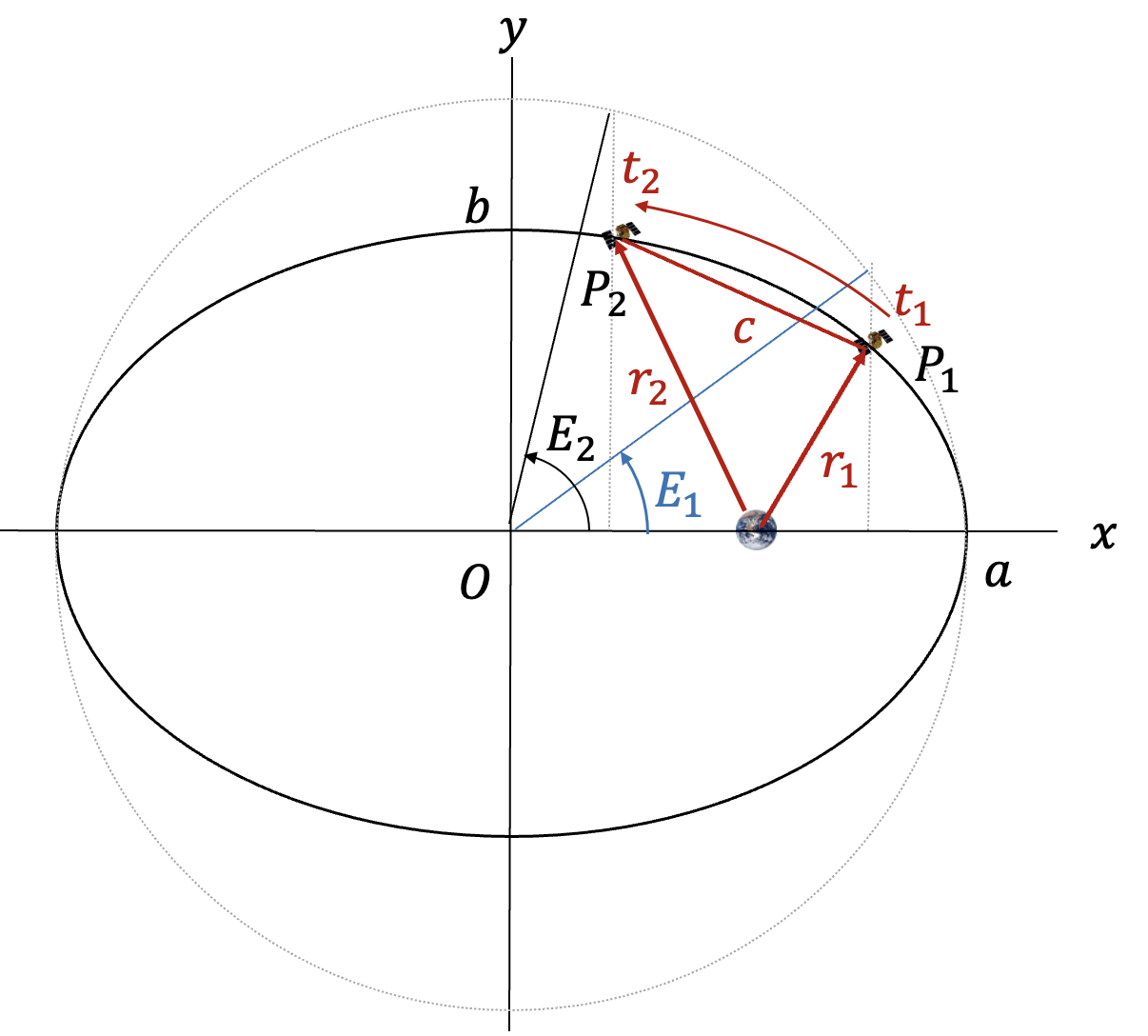 여기서 \(r_1, r_2\) 는 궤도의 촛점(지구 중심)에서 두 지점까지의 거리, \(c\) 는 코드 길이, \(a\) 는 장반경이다.