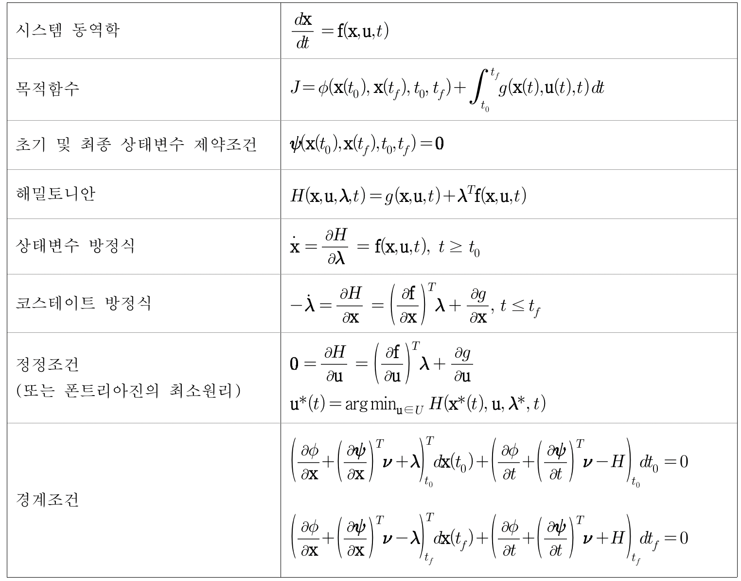 최적제어의 필요조건을 정리한 표에 의하면 다음과 같이 상태변수와 코스테이트(costate) 미분 방정식을 얻을 수 있다.