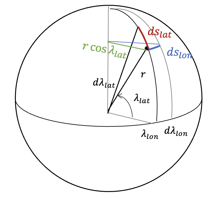 \[ \begin{align} & ds_{lat}=r \ d\lambda_{lat} \tag{3} \\ \\ & ds_{lon}=r \cos \lambda_{lat} \ d \lambda_{lon} \end{align} \]