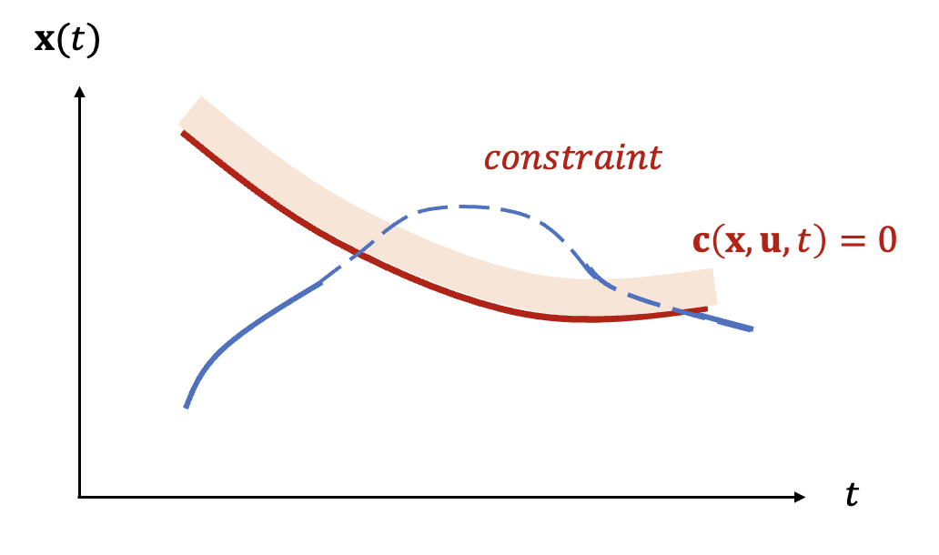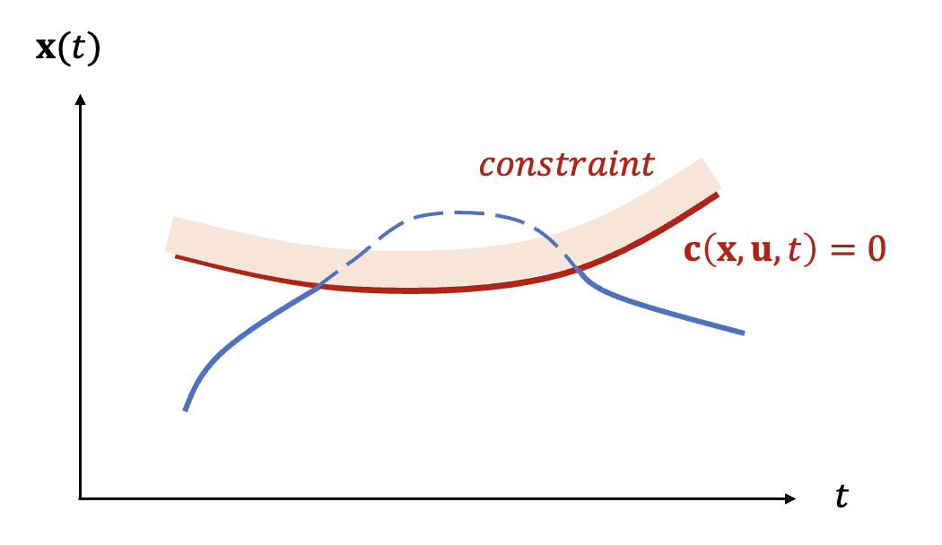 만약 식 (2)의 세번째 유형인 \(\mathbf{c}( \mathbf{x}(t), t)=0\) 과 같이 상태변수만 제약조건에 있다면 문제가 조금 복잡해 진다. 먼저 경로 제약조건을 목적함수에 포함시켜 보자.