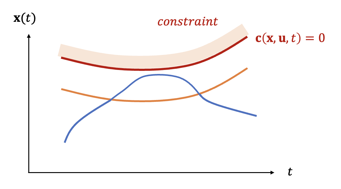 \[ \begin{align} & \mathbf{c}(\mathbf{x}(t), \mathbf{u}(t), t)=0 \tag{2} \\ \\ & \mathbf{c}(\mathbf{u}(t), t)=0 \\ \\ & \mathbf{c}( \mathbf{x}(t), t)=0 \\ \\ & \mathbf{c}(\mathbf{x}(t), \mathbf{u}(t), t) \le 0 \tag{3} \\ \\ & \mathbf{c}(\mathbf{u}(t), t) \le 0 \\ \\ & \mathbf{c}( \mathbf{x}(t), t) \le 0 \end{align} \]