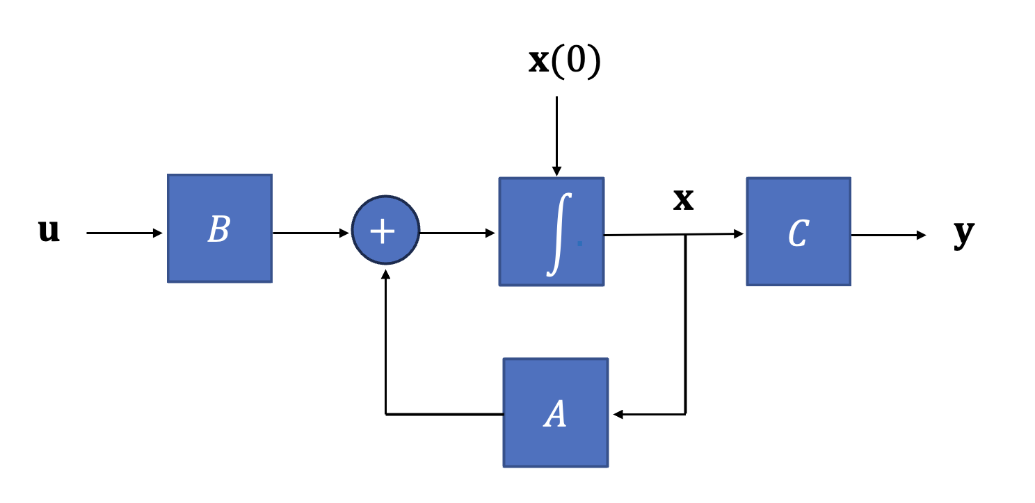\[ \begin{align} \dot{\mathbf{x}} &= A \mathbf{x}+B \mathbf{u} \tag{1} \\ \\ \mathbf{y} &=C \mathbf{x}+D \mathbf{u} \end{align} \]