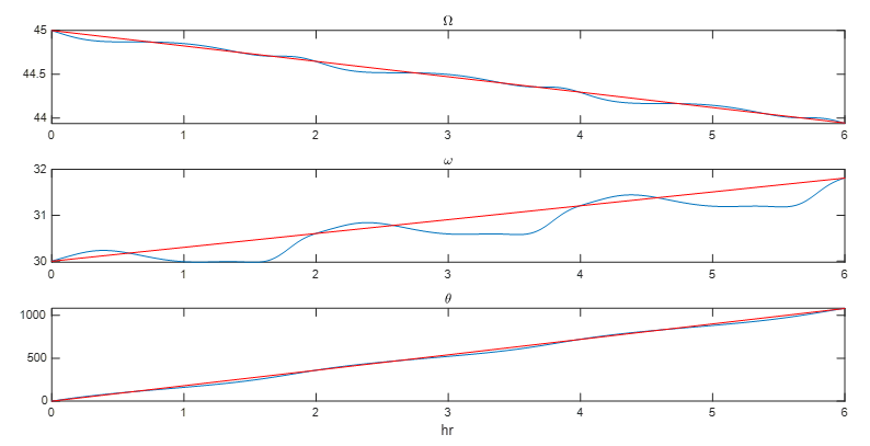 앞선 궤도 예제에 식 (13)을 적용하면 다음과 같은 시뮬레이션 결과를 얻을 수 있다. 그림은 주기의 3배인 6시간에 걸친 J2 섭동에 의한 궤도요소의 시간 변화를 보여준다. 파란색은 식 (1)에 의한 변화, 빨간색은 식 (13)에 의한 평균 변화를 나타낸다.