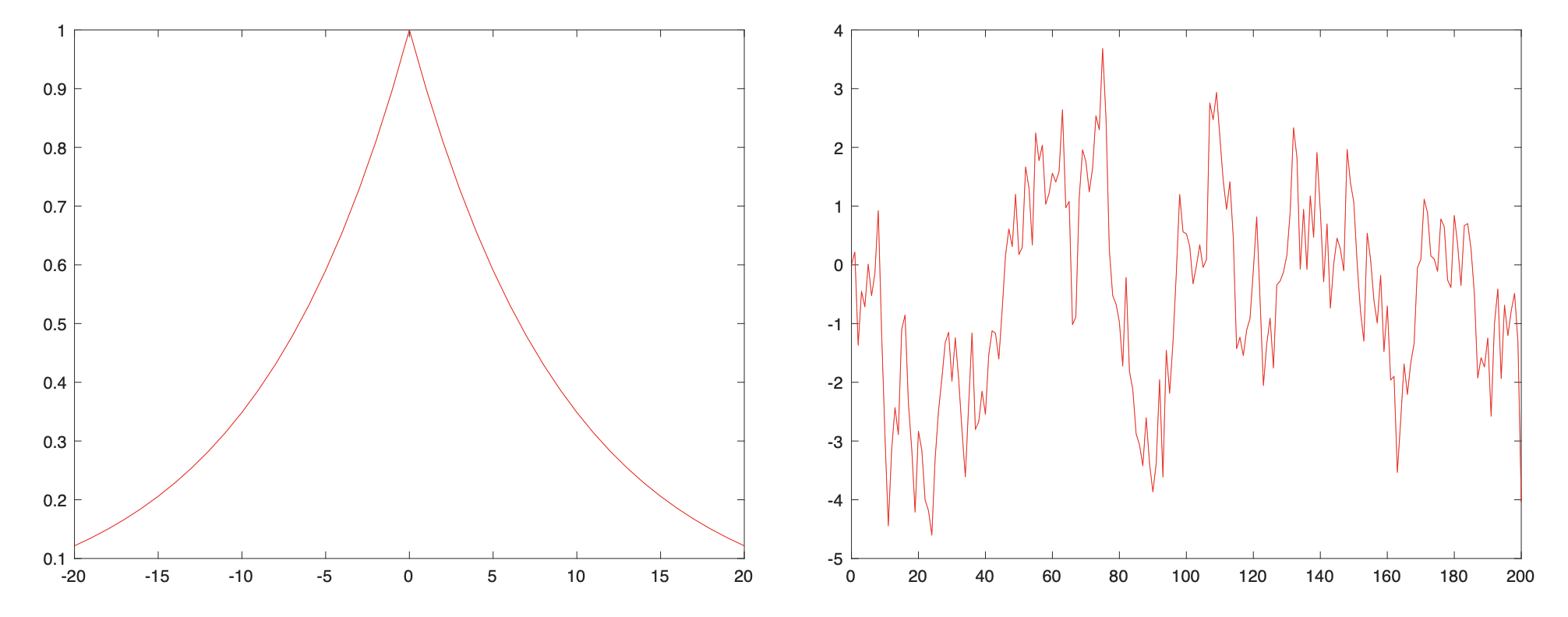 자기상관함수와 자기공분산함수는 동일한 시퀀스 내에서 서로 다른 두 싯점에서의 랜덤벡터 사이의 상관도에 대한 정보를 준다. 자기상관함수의 값이 두 비교 싯점의 시간 간격이 커질수 록 급격히 작아진다면 두 싯점의 랜덤벡터 상관도가 급격히 떨어진다는 의미이고, 반대로 두 비교 싯점의 시간 간격이 커도 서서히 감소한다면 두 시점의 랜덤벡터의 상관도가 높다는 뜻이다. 서로 다른 두 싯점에서의 랜덤벡터가 비상관 관계에 있다면 이는 한 싯점에서의 확률 정보가 다른 싯점에서의 확률 정보를 추정하는 데 아무런 도움이 되지 않는다는 것을 의미한다. 다음 그림은 자기상관함수와 해당하는 랜덤 시퀀스의 샘플 예이다.