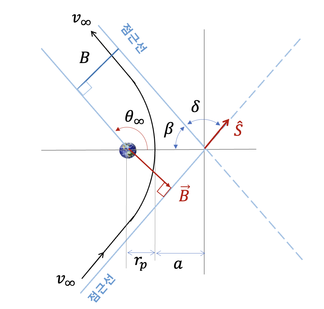 그림에서 \(\hat{S}\) 는 점근선벡터(asymptote vector) 로서 진입 점근선의 방향을 나타내는 단위벡터다. \(\vec{B}\) 는 B-벡터 또는 충격벡터(impact vector)라고 하며 천체의 중심으로부터 진입 점근선까지의 최단거리 벡터로서 진입 점근선과 직교한다. \(\vec{B}\) 의 크기 \(B\) 를 충격파라미터(impact parameter)라고 한다. \(a \lt 0\) 임을 감안하면 그림에서 \(B\) 는 다음과 같이 계산할 수 있다.