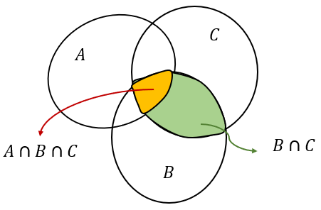 다음으로 조건으로 삼을 만한 사건이 하나 더 있는 경우를 살펴보자. 이 사건을 \( C \)라고 하자. 그러면 사건 \( B \)이기도 하면서 동시에 사건 \( C \)이기도 한 사건이 발생한 조건에서 사건 \( A \)가 발생할 조건부 확률 \( P \{A|B,C \} \)는 다음 그림과 같이