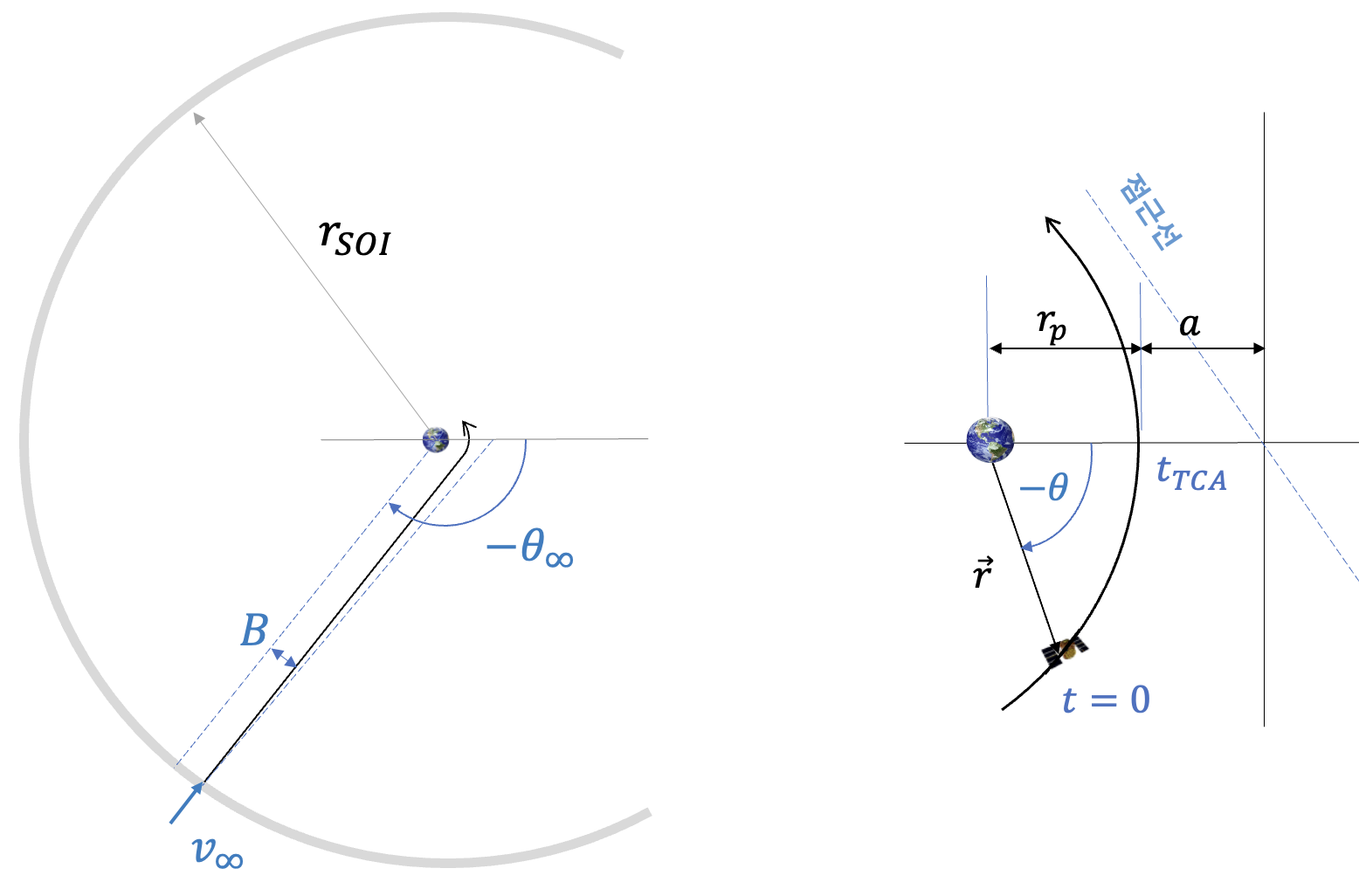 또한 케플러 방정식에 의하면 쌍곡선 궤도의 근지점에서 임의의 위치까지의 비행시간은 다음 식으로 나타낼 수 있다 (https://pasus.tistory.com/309).
