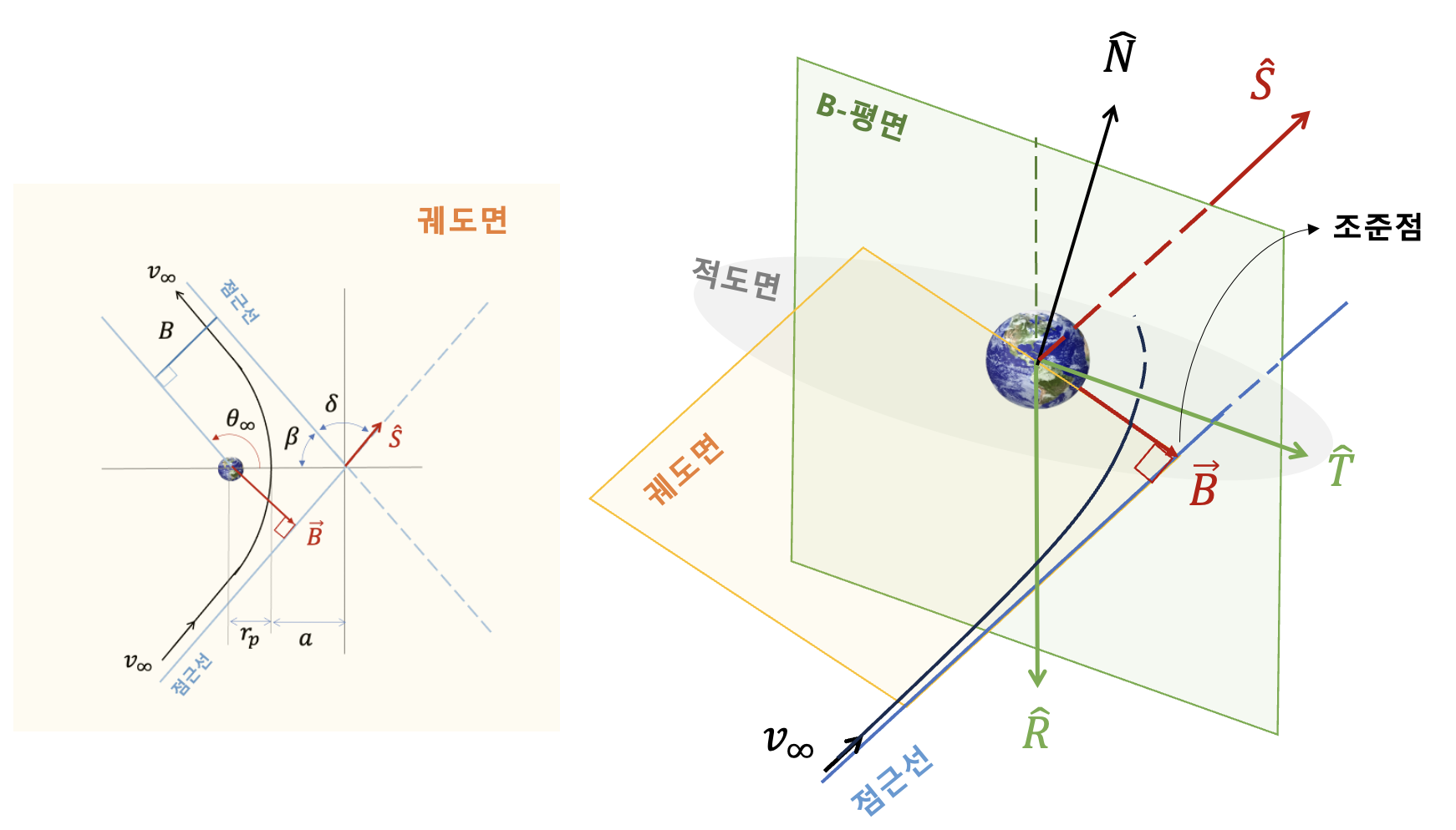 \(\vec{B}\) 는 B-벡터 또는 충격벡터(impact vector)로서 목표 행성의 중심으로부터 진입 점근선까지의 최단거리 벡터이며 진입 점근선과 직교한다. 따라서 \(\hat{S}\) 와 직각인 \(\vec{B}\) 는 궤도면과 B-평면에 동시에 존재한다.