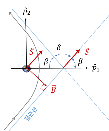 점근선벡터 \(\hat{S}\) 는 아래 그림과 같은 기하학적인 관계식을 이용하여 궤도중심좌표계(perifocal frame)로 표현할 수 있다.