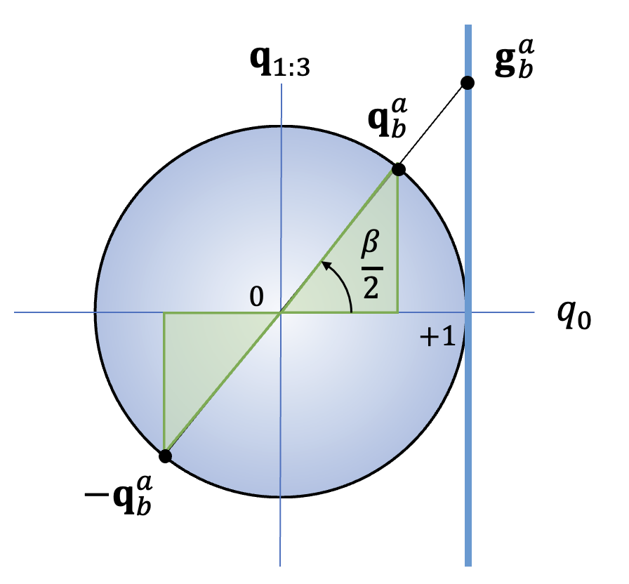 그림에서 x축은 \(q_0\), y축은 \(\mathbf{q}_{1:3}\) 로서 초평면(3차원 공간)이다. 원은 반지름이 1인 4차원 구다. 쿼터니언은 이 4차원 구의 표면에 위치한다. \(q_0=1\) 을 통과하고 원에 접하는 세로선은 4차원 구에 접하는 3차원 초평면을 나타낸다. 로드리게스 파라미터 벡터 \(\mathbf{g}_b^a\) 는 원점에서 쿼터니언을 이 초평면으로 투영한 것이다.