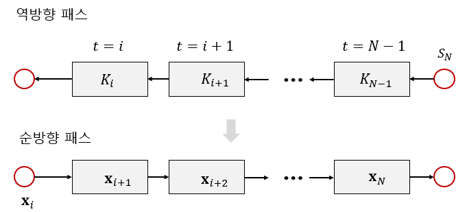 최종값 \( S_N \) 을 이용해서 시간적으로 역순으로 모든 시간스텝에서 \( S_t \) 를 계산할 수 있다. 그러면 식 (7)로 다음과 같이 최적제어를 계산할 수 있다.
