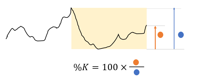 \[ \%K = 100 \times \frac{ \mbox{(현재 종가} - \mbox{기간내 최저가)} }{ \mbox{(기간내 최고가 }- \mbox{기간내 최저가)} } \]
