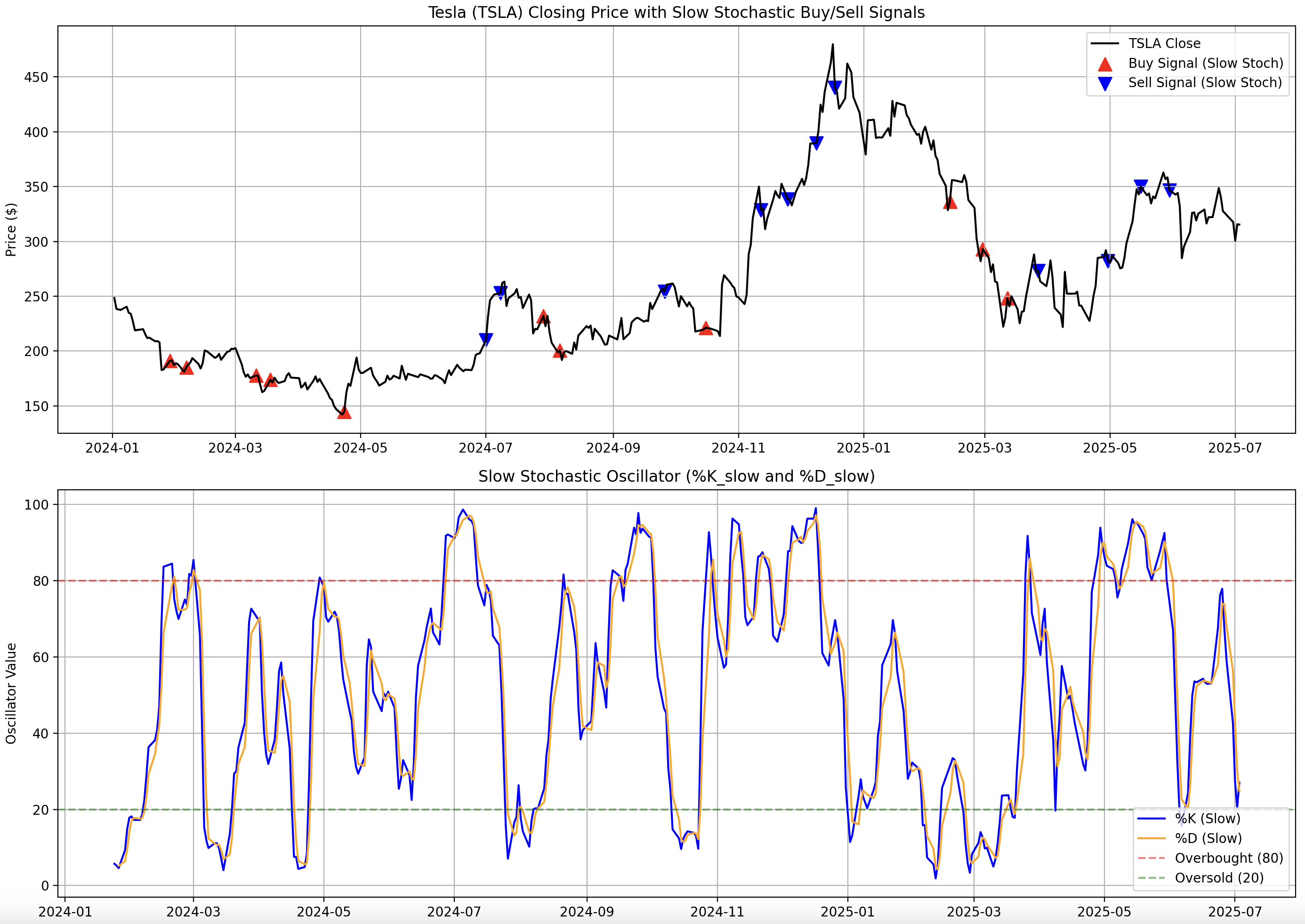 plt.title('Tesla (TSLA) Closing Price with Slow Stochastic Buy/Sell Signals')