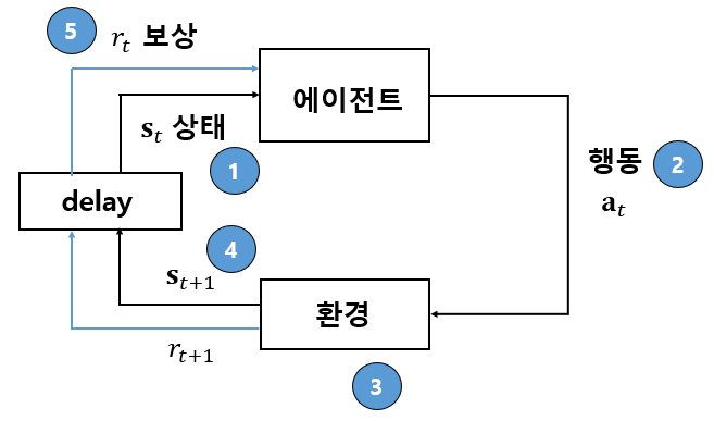 반면에 강화학습(reinforcement learning) 문제는 어떤 에이전트(agent)가 환경(environment)이 주는 누적 보상(reward)의 기댓값을 최대화하기 위해서 시간 순서대로 환경에 가해지는 행동(action)을 결정하는 문제다. 누적 보상의 기댓값 또는 성능지수는 다음과 같이 주어진다.