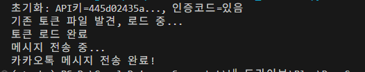 정상적으로 실행되면, kakao_access_token_data.json 파일이 생성되고 카카오톡으로 테스트 메시지가 발송되고 수신된다.