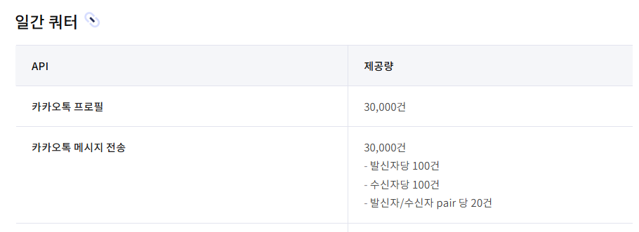 카카오톡 메시지 무료 전송의 쿼터는 다음과 같다.