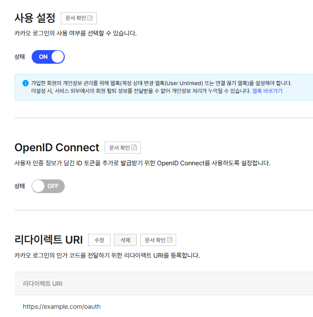 카카오로그인 설정에서 다음과 같이 상태를 ON으로 변경한다.