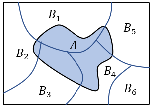 한편 다음 그림과 같이 \( N \)개의 사건 \( \{ B_i, \ i=1,...,n \} \)이 서로 배타적이고 (즉, \( P\{B_i, B_j \}=0,\forall i \ne j \) ), 표본 공간을 모두 망라(exhaustive)하면 (즉 \( \sum_{i=1}^n P \{B_i\}=1 \) ),