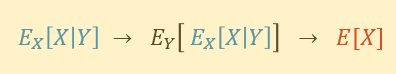 랜덤변수(random variable) \( X \)와 \( Y \)의 함수인 \( g(X,Y) \)의 기댓값 \( \mathbb{E}[g(X,Y)] \)는 다음과 같이 조건부 기댓값을 두 번 반복하여 계산해서 구할 수 있다.
