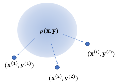 이다. 만약에 데이터가 모집단에서 독립적이고 공평하게 추출된다면 랜덤변수 \( (\mathbf{X}^{(i) }, \mathbf{Y}^{(i) } ) \)는 모두 동일한 확률분포 \(p_{\mathbf{XY}} (\mathbf{x}, \mathbf{y}) \)를 갖는다.
