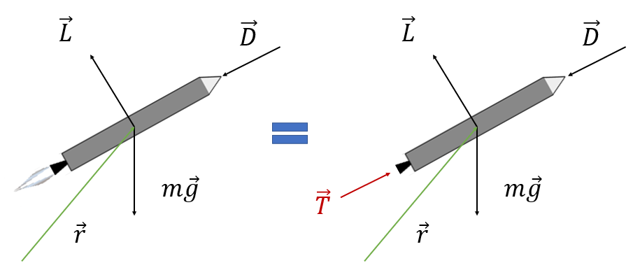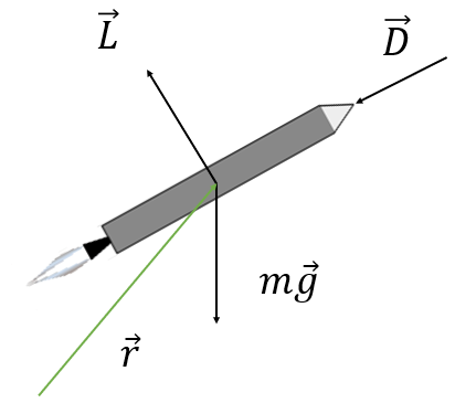 여기서 \(\vec{L}\)은 양력, \(\vec{D}\)는 항력, \(\vec{g}\)는 중력가속도, \(\vec{v}=\frac{^i d\vec{r}}{dt}\)는 속도 벡터, \(m\vec{v}\)는 선형 운동량 벡터다.