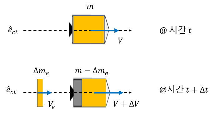 위에 있는 그림은 시간 \(t\)에서 질량 \(m\)인 로켓이 절대 속도 \(V\)로 \(\hat{e}_{ct}\) 방향으로 날아가는 것을 나타내고, 아래 그림은 짧은 시간 \(\Delta t\) 동안에 로켓의 연소과정을 거쳐 적은 질량 \(\Delta m_e\)가 노즐 밖으로 분사되어서 이 영향으로 시간 \(t+\Delta t\)에서 로켓의 질량은 \(\Delta m_e\)만큼 감소하고 속도는 \(\Delta V\)만큼 변화한 것을 나타낸다.