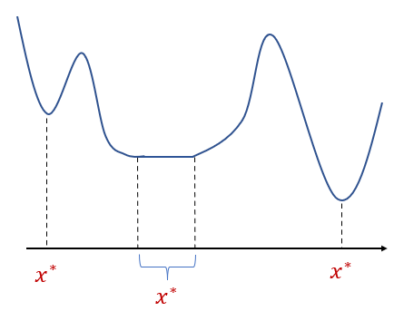 어떤 점 \(\mathbf{x}^\star\)를 기준으로 \(\lVert \mathbf{x}-\mathbf{x}^\star \rVert \le \epsilon \)을 만족하는 모든 \(\mathbf{x}\)에 대해서 \(f(\mathbf{x})-f(\mathbf{x}^\star ) \ge 0 \)인 어떤 값 \( \epsilon \gt 0\)이 존재한다면, \(\mathbf{x}^\star\)를 로컬 최소점이라고 한다.