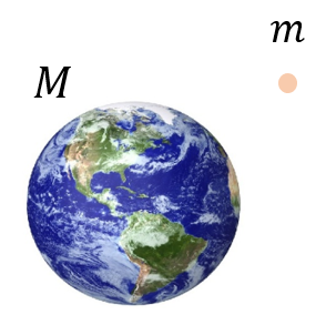 \(M\)을 지구로 보면 지구와 질점 \(m\)간의 만유인력에 의한 질점 \(m\)의 중력 가속도 크기 \(g\)는 다음 식을 만족한다.