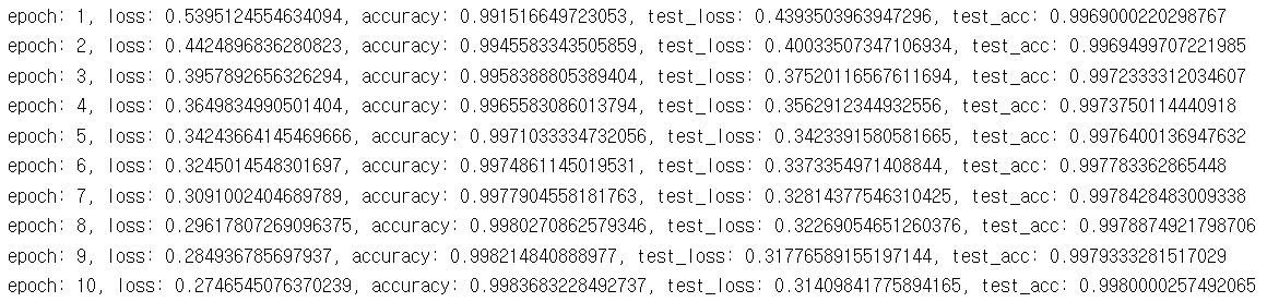 에폭 10번의 학습을 실시하며 에폭마다 학습 결과를 표시한다.