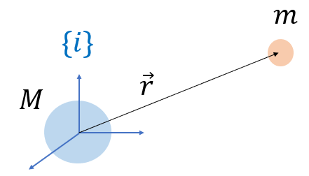 여기서 \(\mu =GM\)은 중력 파라미터, \(\vec{r}\)은 관성 좌표계 \(\{i\}\)의 원점에서 질점 \(m\)까지의 위치 벡터, \(r\)은 위치 벡터의 크기, 즉 거리다.