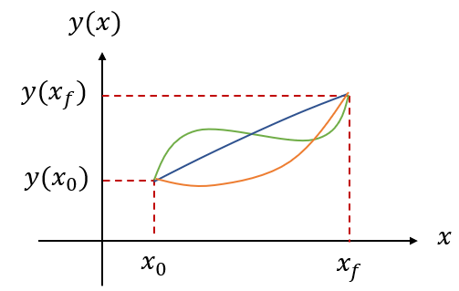 여기서 \(y(x)\)는 \(x\)의 함수이고, \(y^\prime (x)= \frac{dy}{dx}\)는 \(y(x)\)의 도함수이며, 적분 구간의 양쪽 경계 \(y(x_0)\)와 \(y(x_f)\)는 고정된 값으로 가정한다.