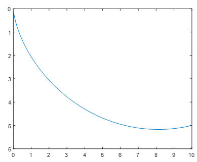 예를 들어서 상단 지점 \((0, 0)\)에서 하단 지점 \((10, 5)\)미터까지 최단 시간 이동 경로를 구해보자. 먼저 \(a\)와 \(\theta_f\)를 계산하면 다음과 같다.