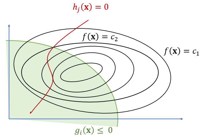 \[ \begin{align} & \mathbf{g}(\mathbf{x}) = \begin{bmatrix} g_1 (\mathbf{x}) \\ \vdots \\ g_m (\mathbf{x}) \end{bmatrix} \le 0 \\ \\ & \mathbf{h}(\mathbf{x}) = \begin{bmatrix} h_1 (\mathbf{x}) \\ \vdots \\ h_k (\mathbf{x}) \end{bmatrix} = 0 \end{align} \]