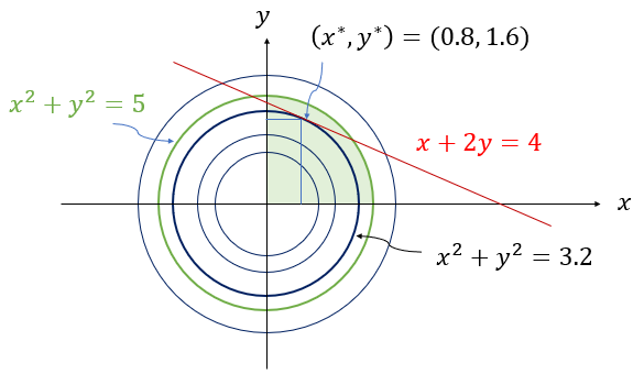 그림에서 검은색 동심원은 \(x^2+y^2=c\) 를 그린 것이다. 녹색 원은 \(x^2+y^2=5\) 를 그린 것이다. 그리고 1사분면에 있는 녹색 영역이 부등식 제약조건이다. 빨간색 직선은 등식 제약조건을 그린 것이다. 문제에 의하면 녹색 영역안에 있으면서 동시에 빨간색 직선과 접하는 동심원의 최대 반지름의 제곱이 최적해가 된다. 이 값은 \(x^\star=0.8, y^\star=1.6\) 일 때, \(f(x^\star, y^\star ) = (x^\star)^2+(y^\star)^2 =3.2\) 이다.