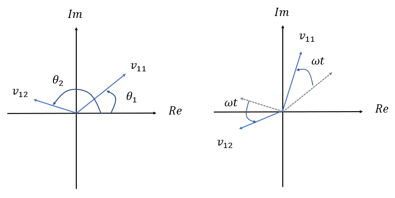 그러면 고유값에 대응하는 고유벡터도 서로 켤레 복소수인 벡터가 된다. 곱셈에서는 복소수를 크기와 위상각 형태로 쓰는 것이 유리하므로 고유벡터는 다음과 같이 표현한다.