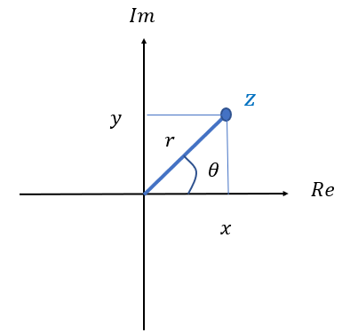 여기서 \(r\)은 복소수의 크기, \(\theta\)는 위상각이며 각각 다음과 같이 계산할 수 있다.