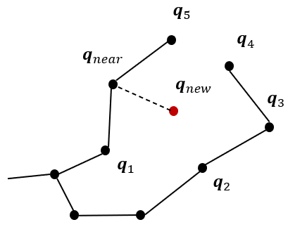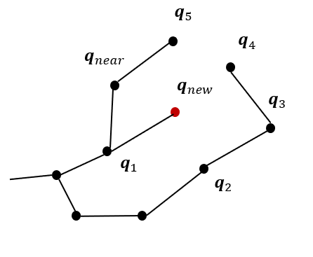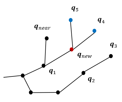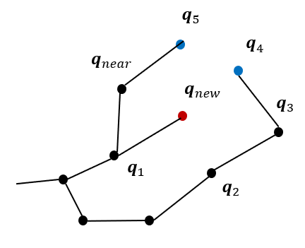 RRT*에서는 \(\mathbf{q}_{new}\)를 중심으로 일정 반경에 있는 노드(그림에서 \(\mathbf{q}_1, \mathbf{q}_2, \mathbf{q}_3, \mathbf{q}_4, \mathbf{q}_5, \mathbf{q}_{near}\))를 뽑고,