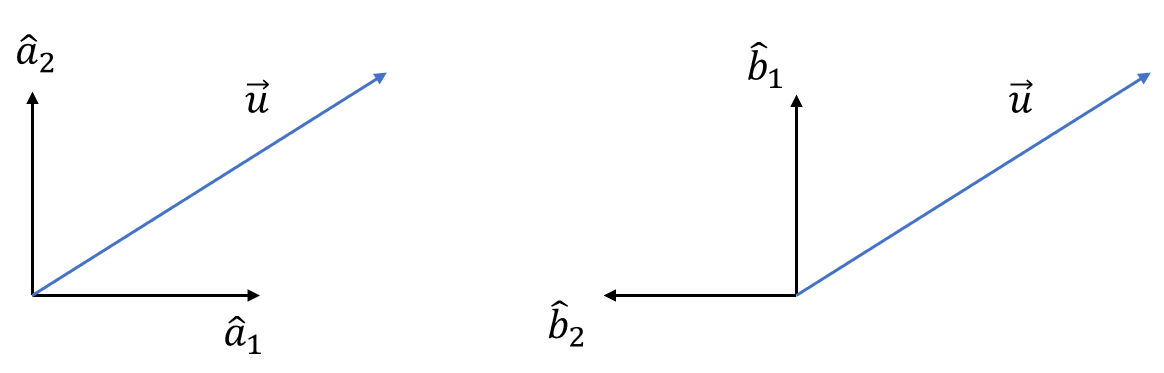 이기 때문이다. 여기서 \(\theta\)는 벡터 \(\vec{u}\)와 \(\hat{a}_1\)의 사잇각이므로 \(u_1\)은 벡터 \(\vec{u}\)를 단위벡터 \(\hat{a}_1\)이 가리키는 방향으로 투사한 길이가 된다.