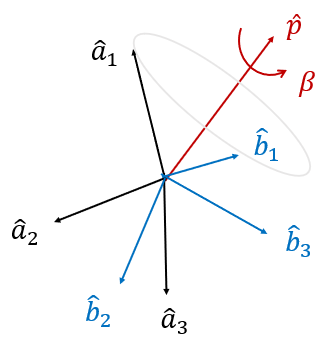 좌표계 \(\{a\}\)를 회전축 \(\hat{p}\) 를 중심으로 회전각 \(\beta\) 만큼 회전하여 좌표계 \(\{b\}\)로 변환했다고 하면, 좌표계 \(\{a\}\)에서 좌표계 \(\{b\}\)로의 쿼터니언 \(q_b^a\)는 다음과 같이 정의된다.