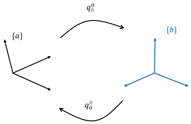 좌표계 \(\{b\}\)에서 좌표계 \(\{a\}\)로의 쿼터니언은 벡터 \(q\)의 위 첨자와 아래 첨자를 반대로 써서 \(q_a^b\)로 표현할 수 있다. \(q_b^a\)와 \(q_a^b\)는 서로 역변환 관계로서 \(q_a^b=\left( q_b^a \right)^\star\)의 식이 성립한다.