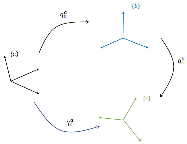 좌표계 \(\{a\}\)에서 좌표계 \(\{c\}\)로의 쿼터니언을 직접 계산할 수도 있지만 중간 단계의 좌표계 \(\{b\}\)를 두고 각각의 쿼터니언을 계산해서 구할 수도 있다는 이야기다. 즉 \(\{a\}\)에서 \(\{c\}\)로 가는 것은 \(\{a\}\)에서 \(\{b\}\)로, 다시 \(\{b\}\)에서 \(\{c\}\)로 가는 것과 같다는 뜻이다.