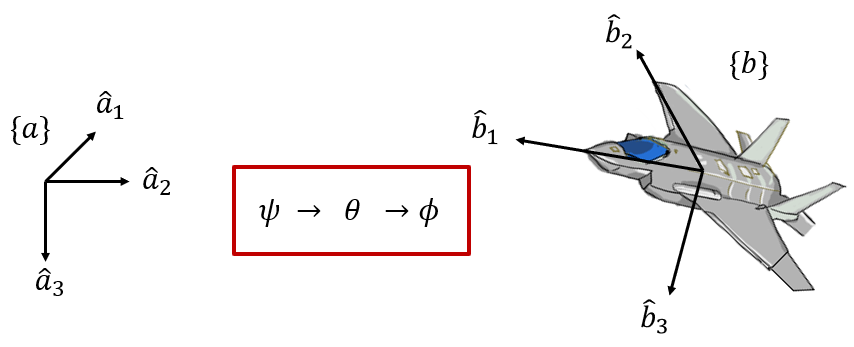 또 다른 단점으로는 연쇄법칙이 적용 안된다는 것이다. 좌표계 \(\{a\}\)에서 \(\{b\}\)로의 오일러각이 \(\phi_1, \theta_1, \psi_1\)이고, 좌표계 \(\{b\}\)에서 \(\{c\}\)로의 오일러각이 \(\phi_2, \theta_2, \psi_2\)라고 할 때, 좌표계 \(\{a\}\)에서 \(\{c\}\)로의 오일러각을 \(\phi_1, \theta_1, \psi_1\)과 \(\phi_2, \theta_2, \psi_2\)를 이용해서 계산하는 방법이 없다는 뜻이다. DCM과 쿼터니언의 경우는 쉬웠다.