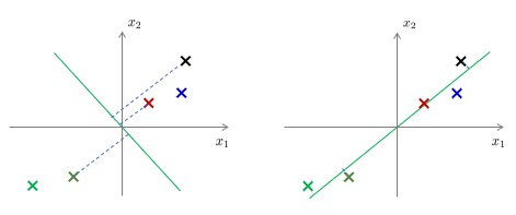 그렇다면 오차를 최소화하기 위해서는 좌표축의 방향(성분)은 어떻게 결정해야 할까. 우선 원래의 데이터를 어떤 좌표축에 투사시켰을 때 생기는 투사 오차(projection error)를 최소화하도록 좌표축을 정하면 될 것 같다.