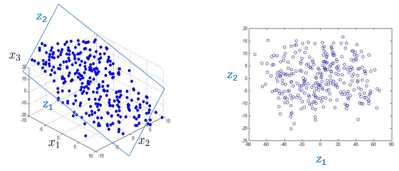 다음과 같이 3차원 공간상에 표현된 데이터 \(\mathbf{x}^{(i)}\)도 2차원 평면상의 직교 좌표축에 투사시켜서 차원을 축소할 수 있다 (\(\mathbb{R}^3 \to \mathbb{R}^2\)). 고차원 공간상의 데이터도 비슷한 방법으로 저차원 공간으로 차원을 축소할 수 있다 (\( \mathbb{R}^n \to \mathbb{R}^d \)).