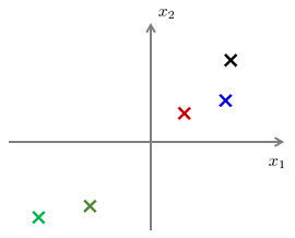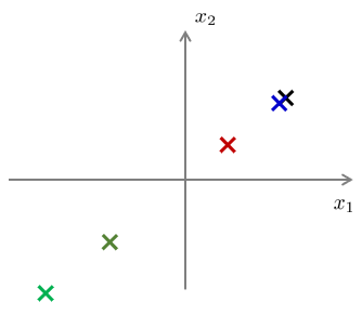 다음과 같이 2차원 공간(평면)상에 표현된 데이터 \(\mathbf{x}^{(i)}, \ i=1,...,m\) 이 있다.